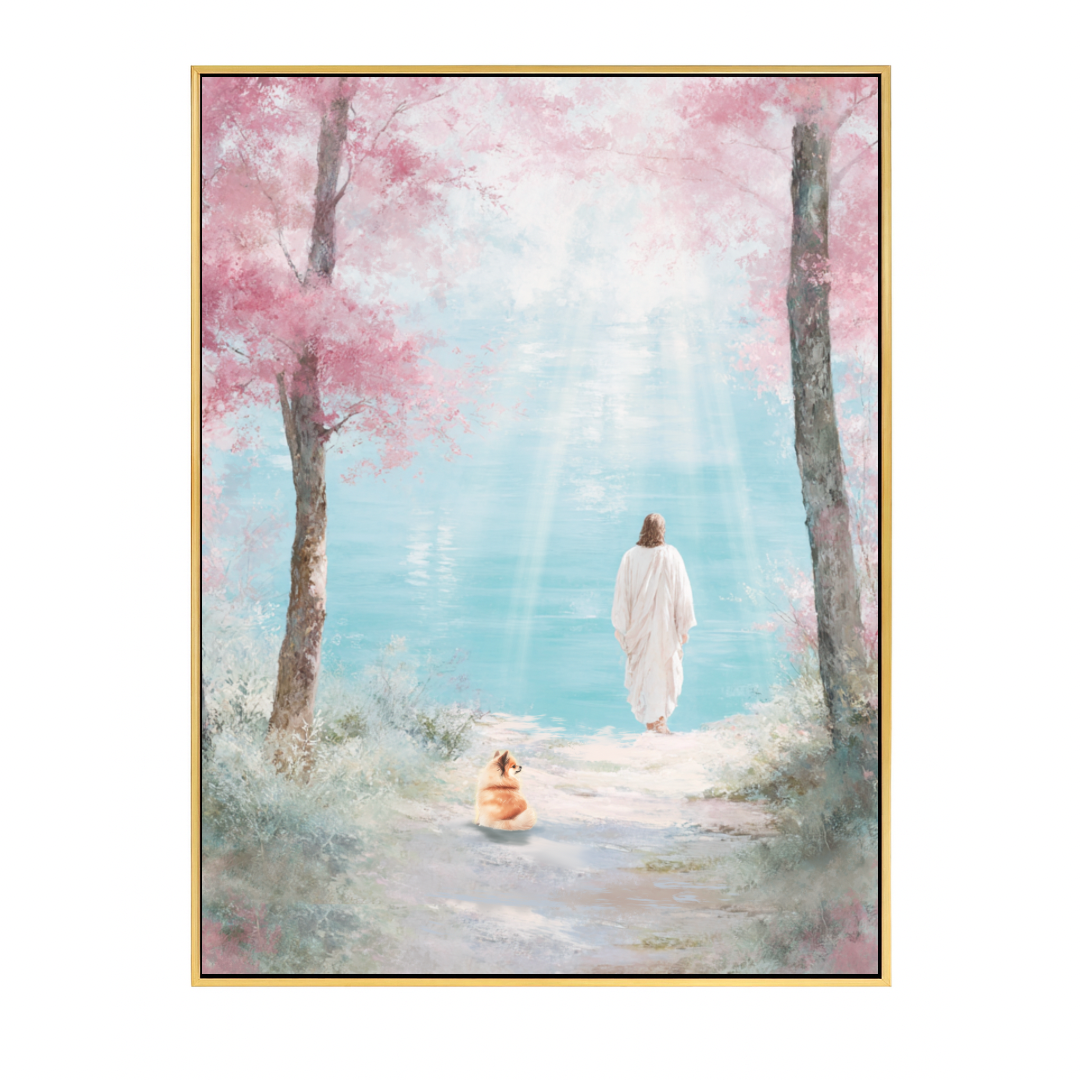 This serene artwork captures a deeply comforting scene of Jesus walking on water towards the light with His faithful companion by His side. Framed by soft pink blossoms, and bathed in heavenly rays, the piece symbolizes eternal love, companionship, and the promise of peace beyond this life.