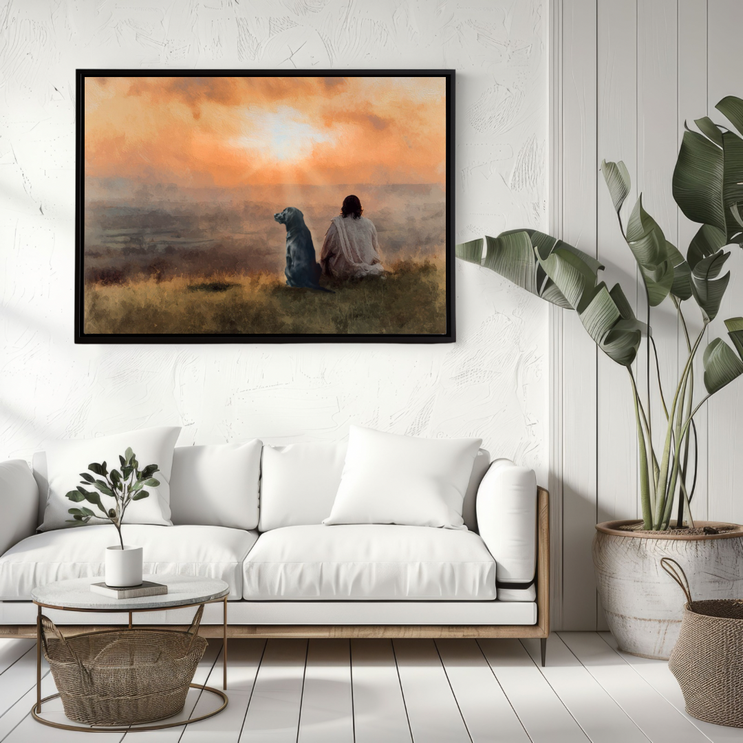 This heartfelt artwork portrays a quiet, sacred moment - Jesus sitting beside His loyal pal as they watch the sunset over a peaceful horizon. The warm golden tones of the sky blend with soft, textured brushstrokes to create a sense of comfort, reflection, and eternal companionship.